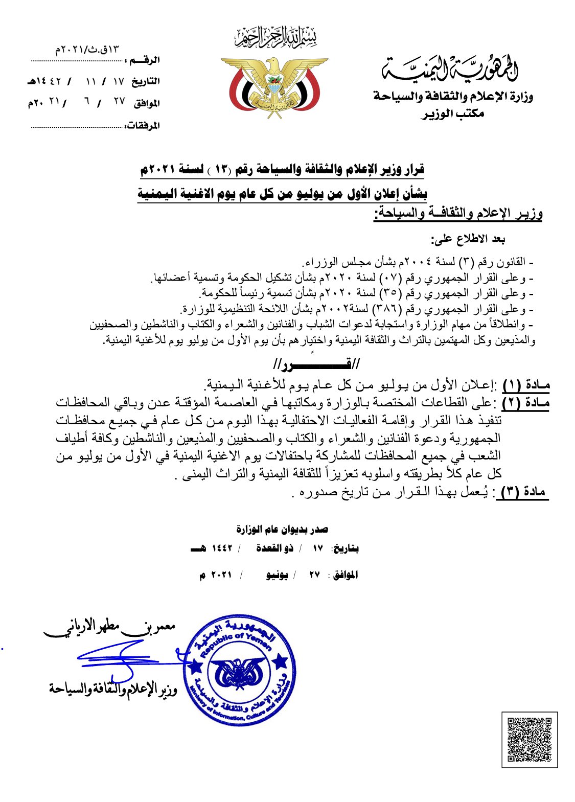 رسميا اليمن تعلن 1 يوليو يوم الأغنية اليمنية من كل عام